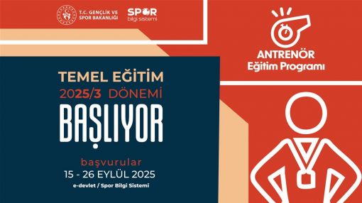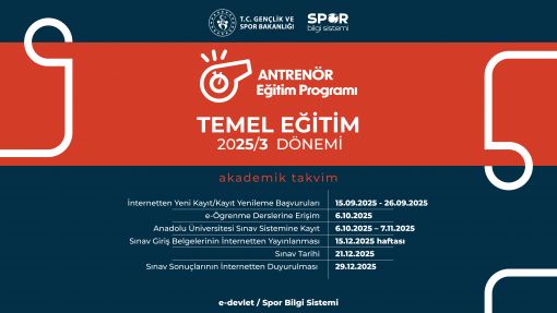 Temel Eğitim uzaktan eğitim modeli ile Anadolu Üniversitesi Sürekli Eğitim Uygulama ve Araştırma Merkezi bünyesinde yürütülmektedir. Temel Eğitim başvuruları 15-26 Eylül 2025 tarihleri arasında e-Devlet Kapısı-GSB-Spor Bilgi Sistemi üzerinden gerçekleştirilecektir. Başvurularını yapan adayların belirtmiş oldukları e-posta adresine referans numarası iletilecektir. Antrenör temel eğitim ve kayıt yenileme (bütünleme) sınav ücreti ödemelerini referans numaraları ya da Türkiye Cumhuriyeti Vatandaşlık numaraları ile 15 Eylül 2025 tarihinden itibaren, 26 Eylül 2025 saat 17:00' a kadar Ziraat Bankası Şube/Atm ve Mobil (Kurumsal Ödemeler/Gençlik ve Spor Bakanlığı Kursiyer ödemeleri) ödeme kanallarından gerçekleştirebilecektir. Temel Eğitim başvuru ücretleri ilk kayıt için 1000 TL, bütünleme başvuruları için 750 TL'dir.